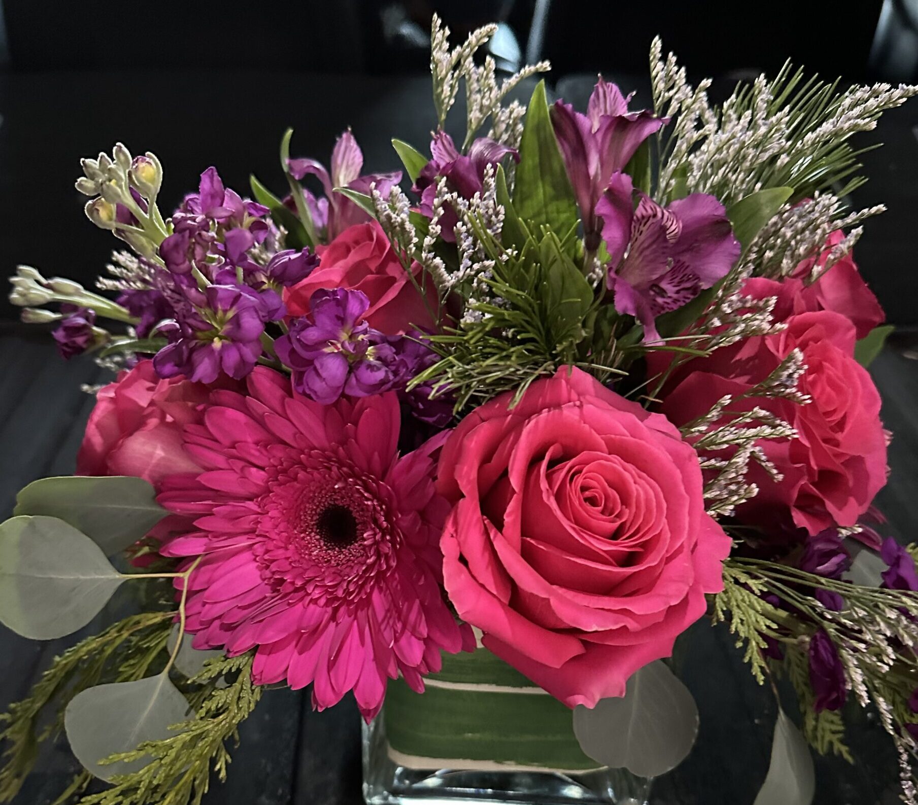 This HOT pink bouquet is sure to draw attention! Each bouquet is designed in a glass cube with mixed greenery to show off a mixture of bright pink spray roses, fuschia gerbera daisies, long lasting carnations and accent blooms.