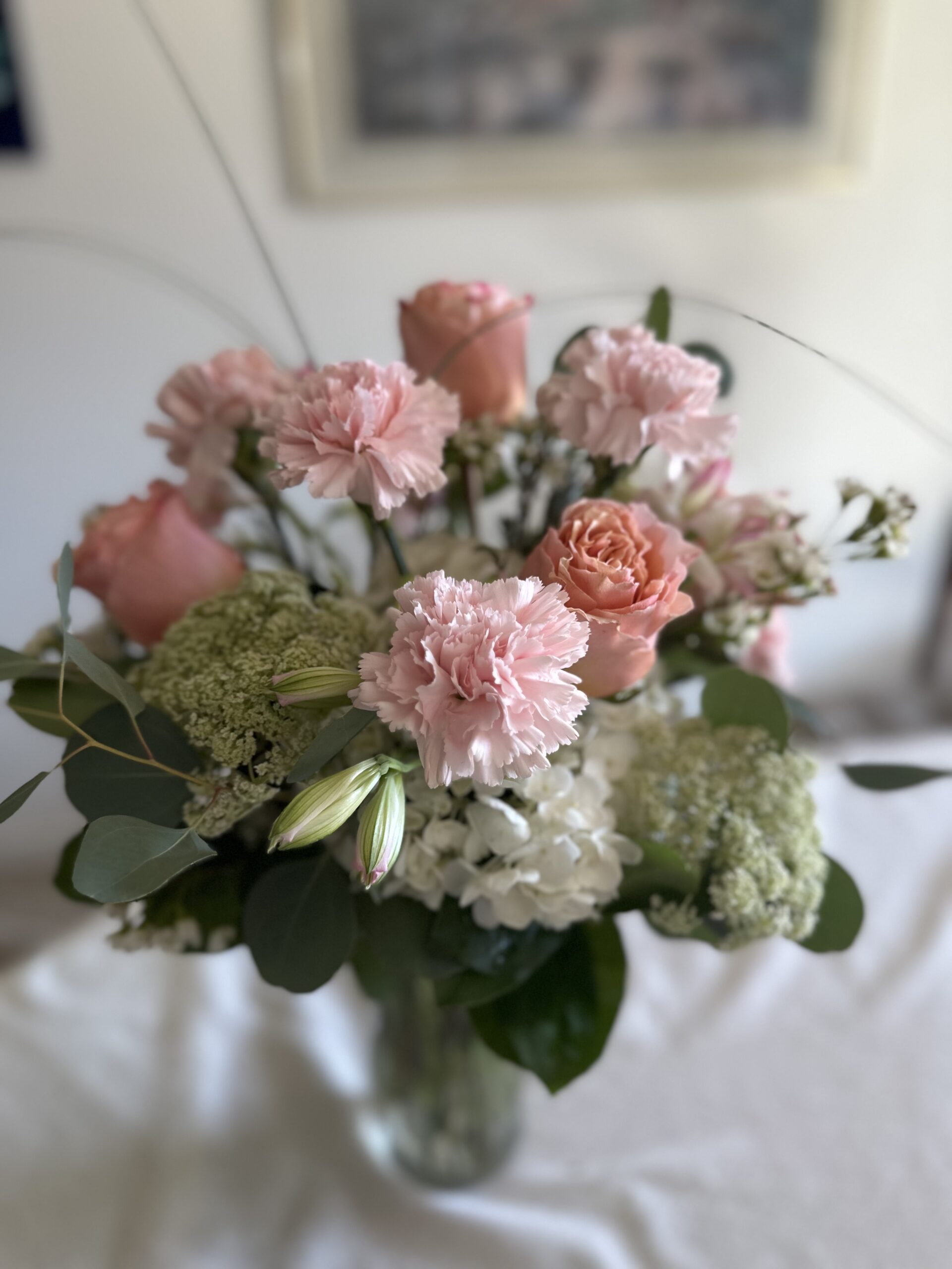 As soft and gentle as a mother’s touch, this bouquet in shades of pink features roses, alstroemeria and carnations on a bed of white hydrangeas and textural accent blooms in a clear glass vase.