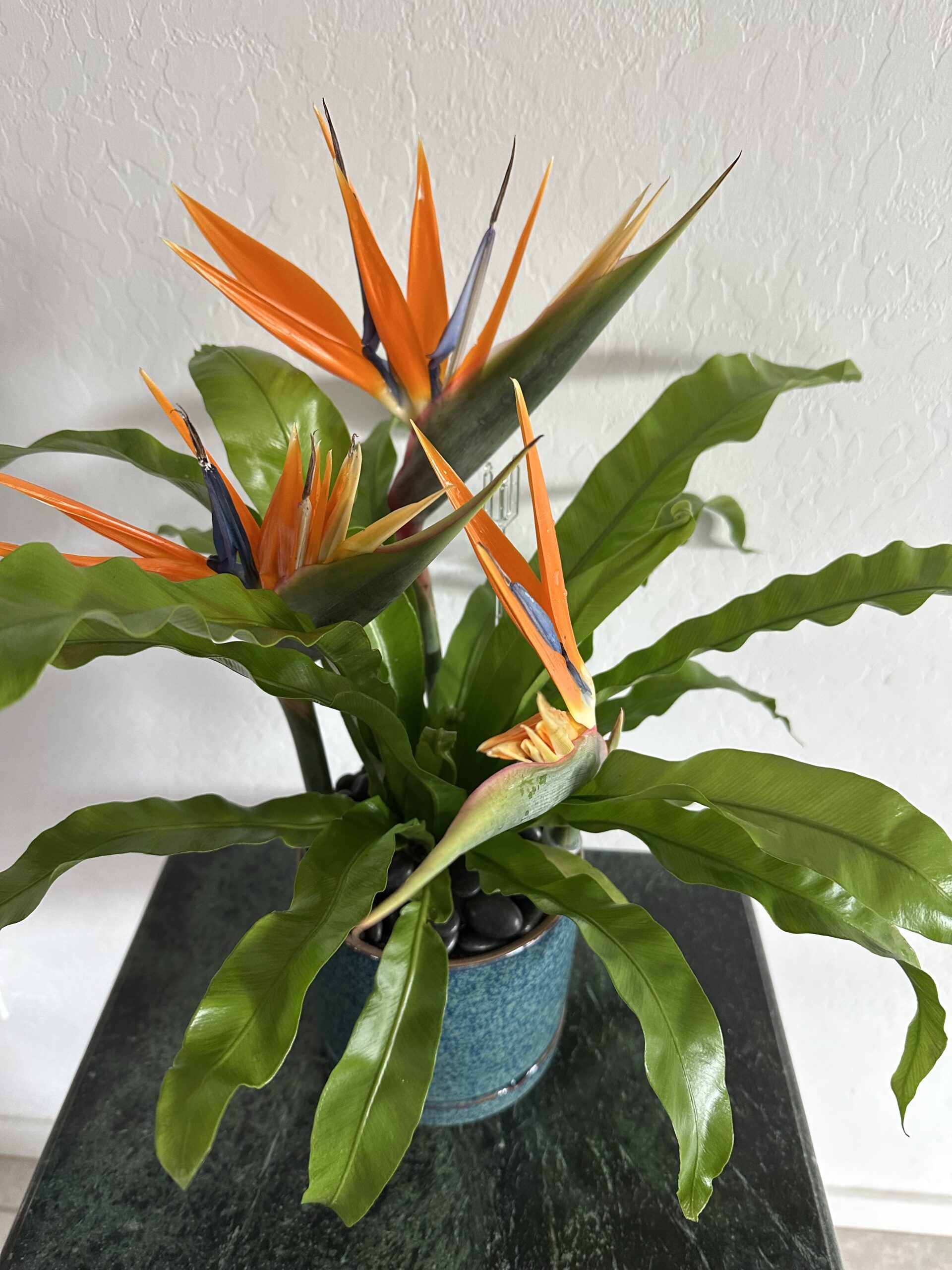 Birds of Paradise cut flowers added to this Bird’s Nest Fern potted in a 6″ ceramic planter. (Green plants may vary based on availability)