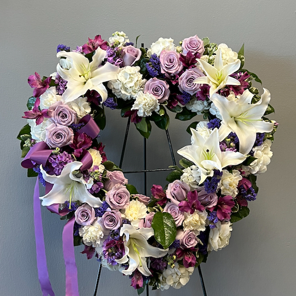 A loving tribute of fresh flowers in your color choice, covering an open heart form being displayed on a wire easel.