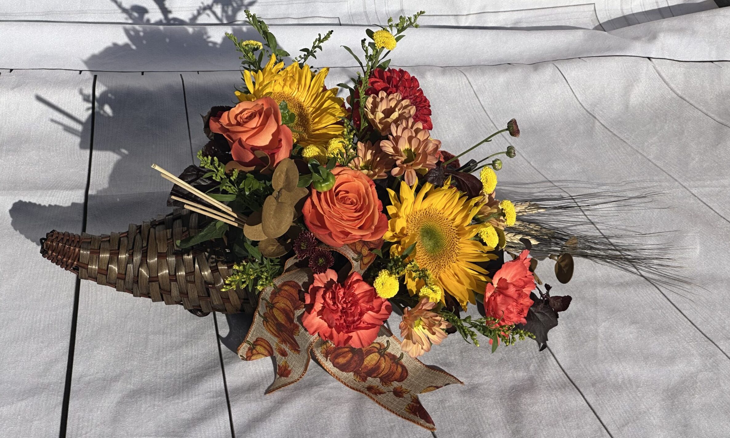 Elevate your gathering with this bountiful cornucopia bouquet bursting with fall colors featuring sunflowers, roses, carnations and fall mums.